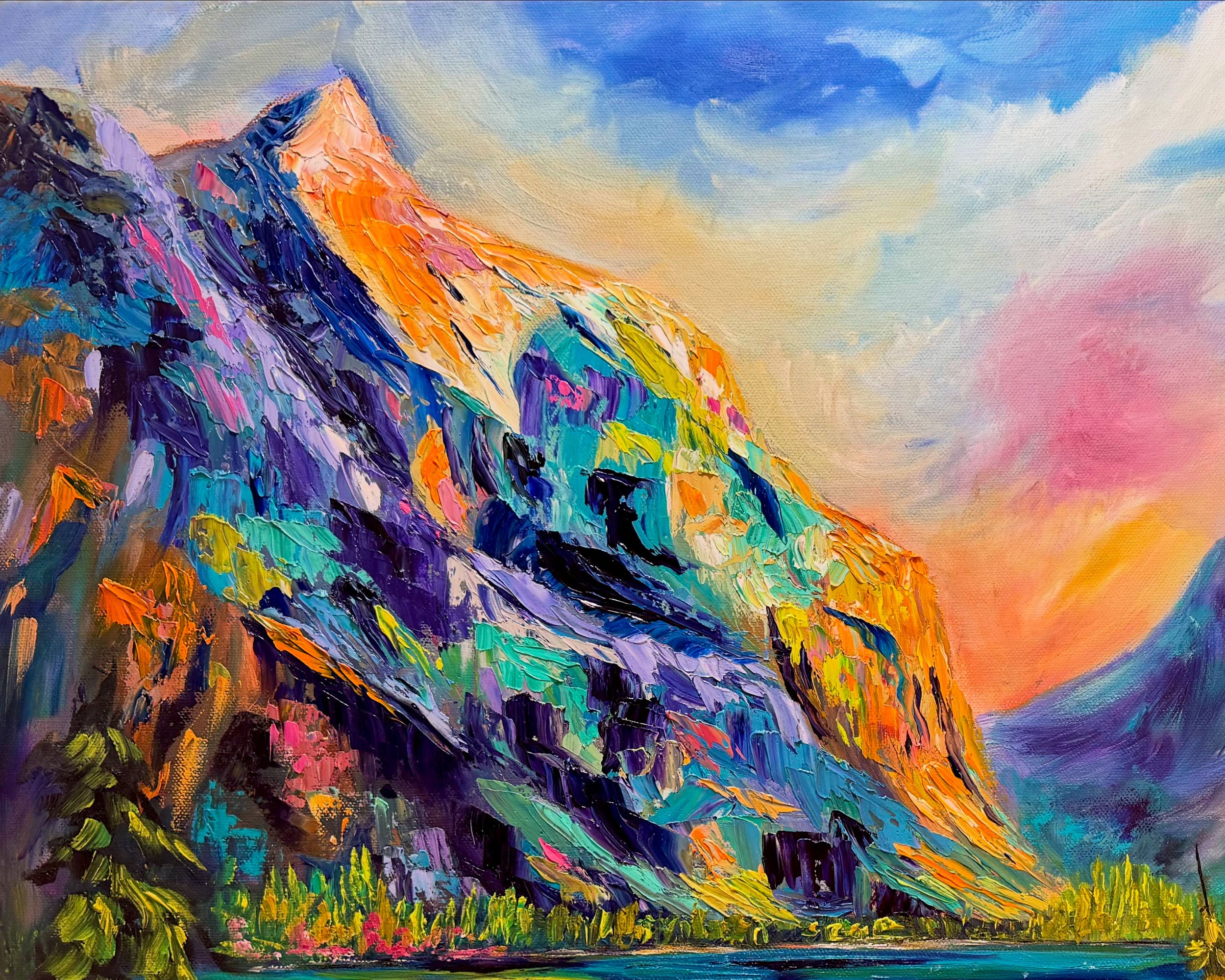 Painted entirely in oils, this piece was all about capturing feeling rather than perfect realism. At first I wasn’t quite sure where I wanted my viewers to land their gaze upon but I knew that I wanted to create something that would make them want to pause and breathe a little deeper. I wanted the colours and movement to reflect the sense of calm and awe this landscape offers as I see it in my mind.