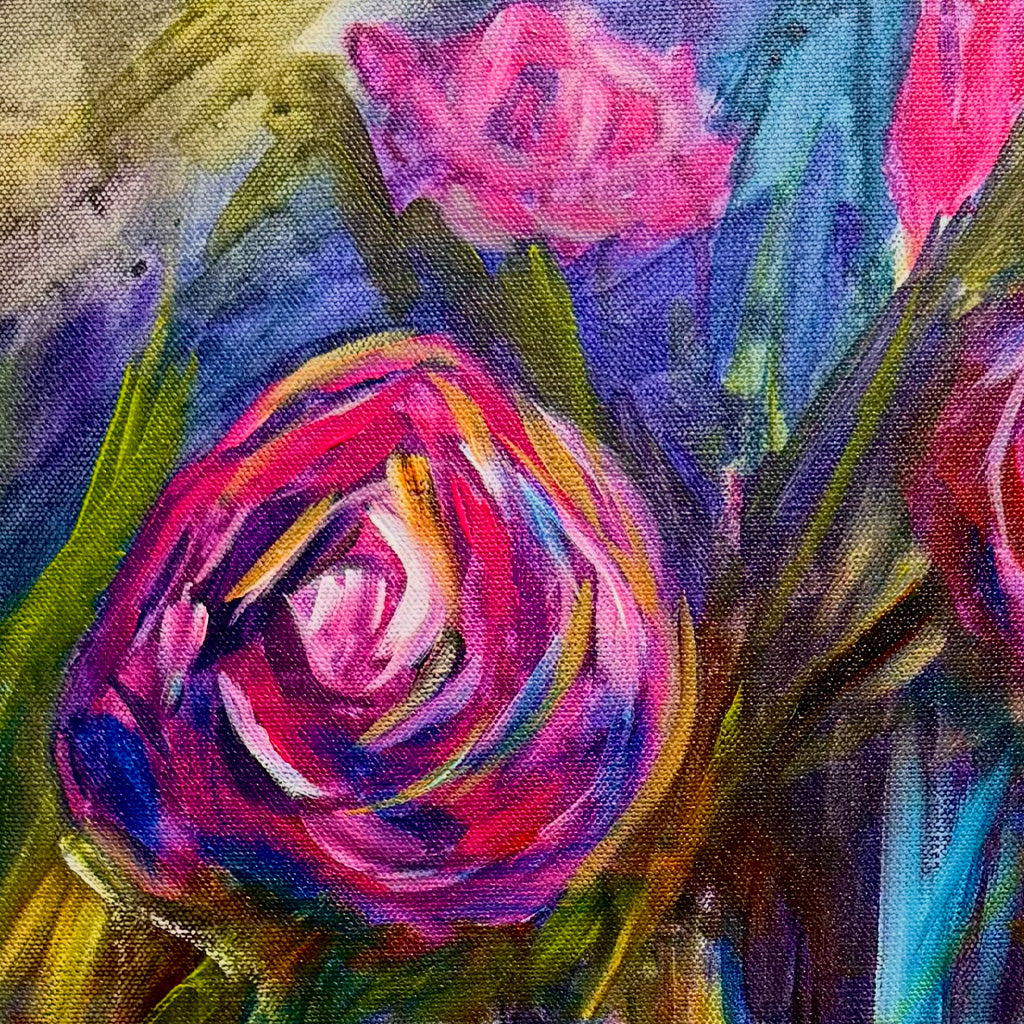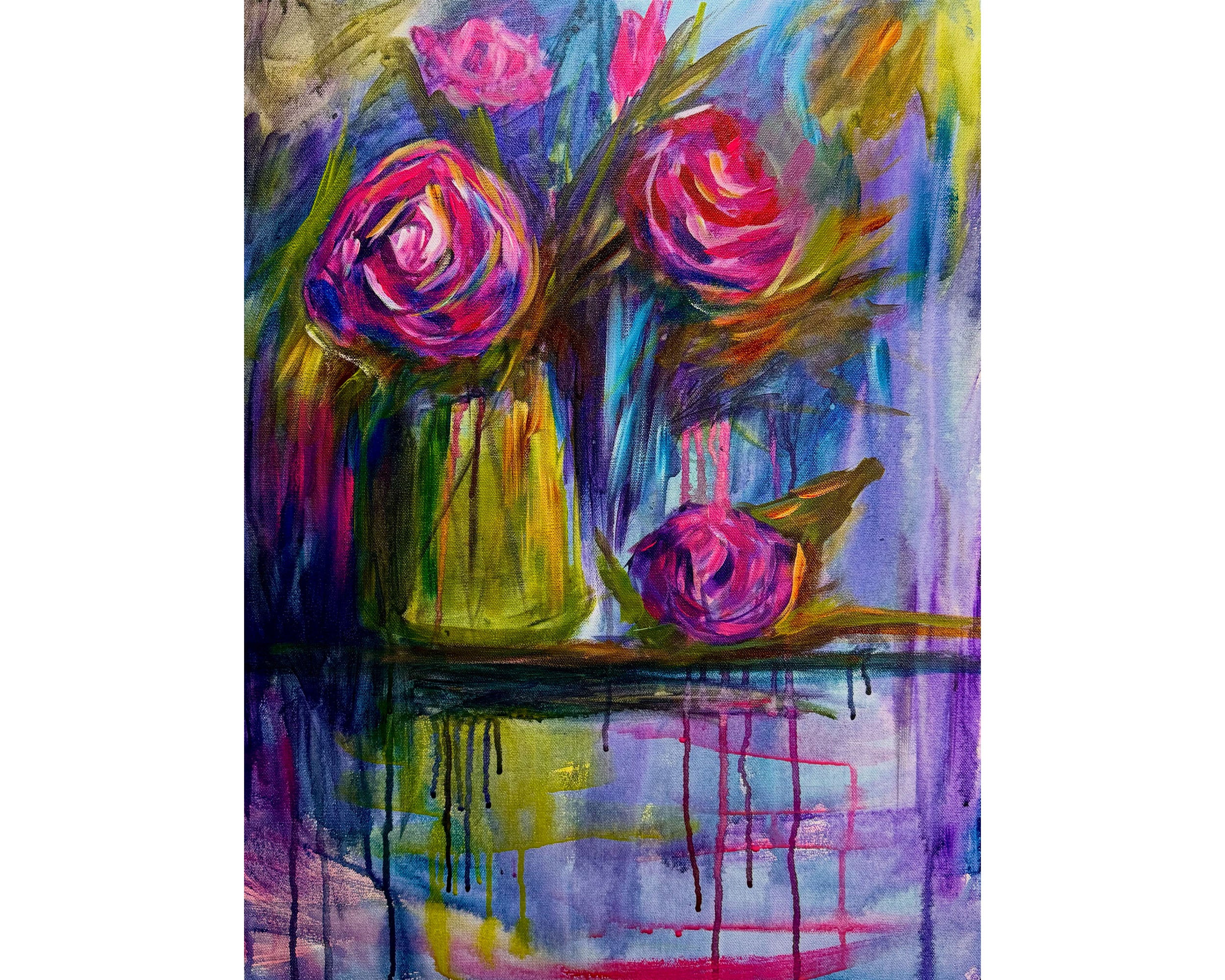 Weeping Roses is an expressive abstract floral painting that captures the quiet beauty of vulnerability, resilience and emotional release. This piece features luminous pink and magenta roses set against a dreamy wash of purples, blues and soft greens. Dripping paint and layered brushstrokes create a sense of movement like emotions gently falling away and inviting the viewer to pause, reflect and feel.