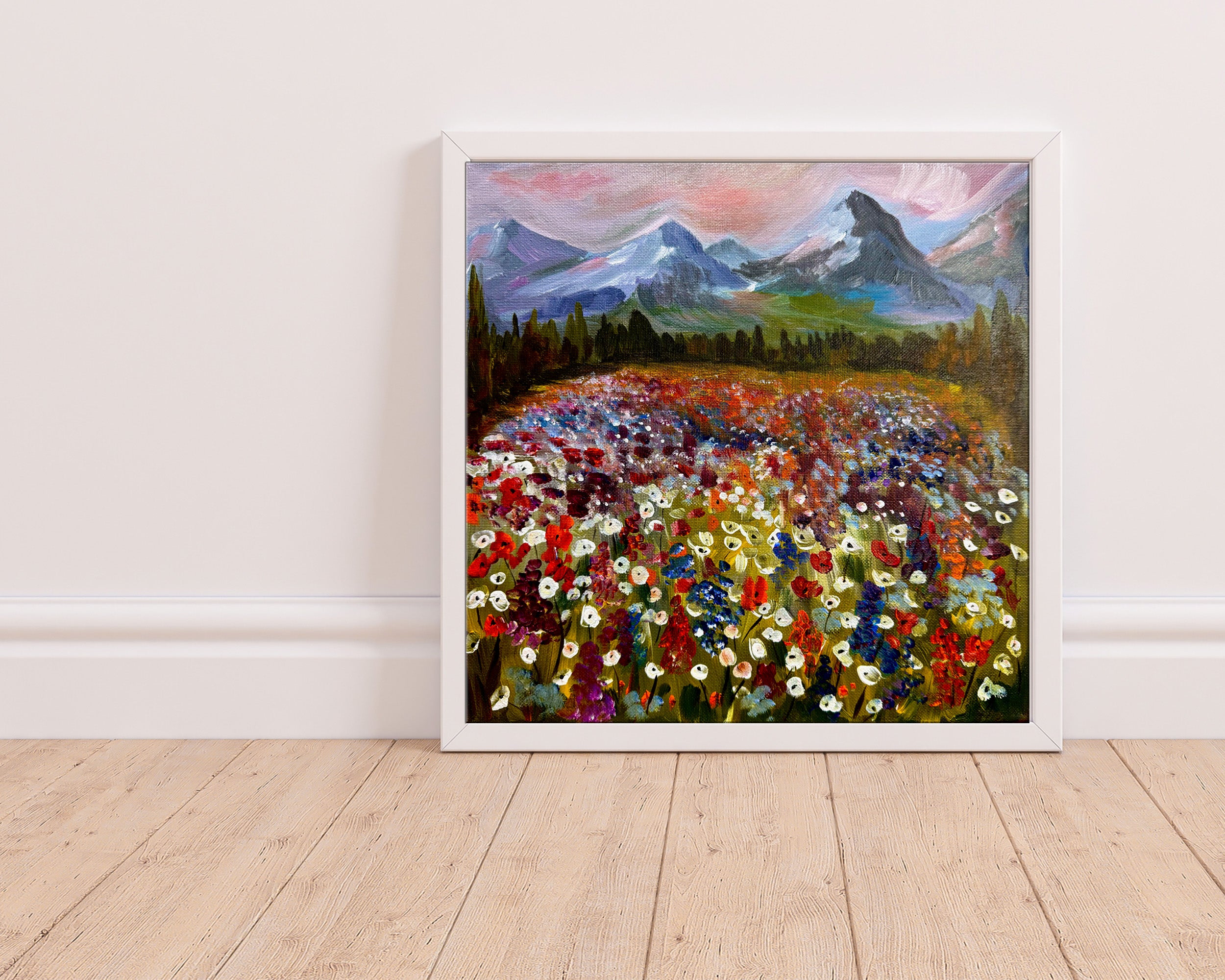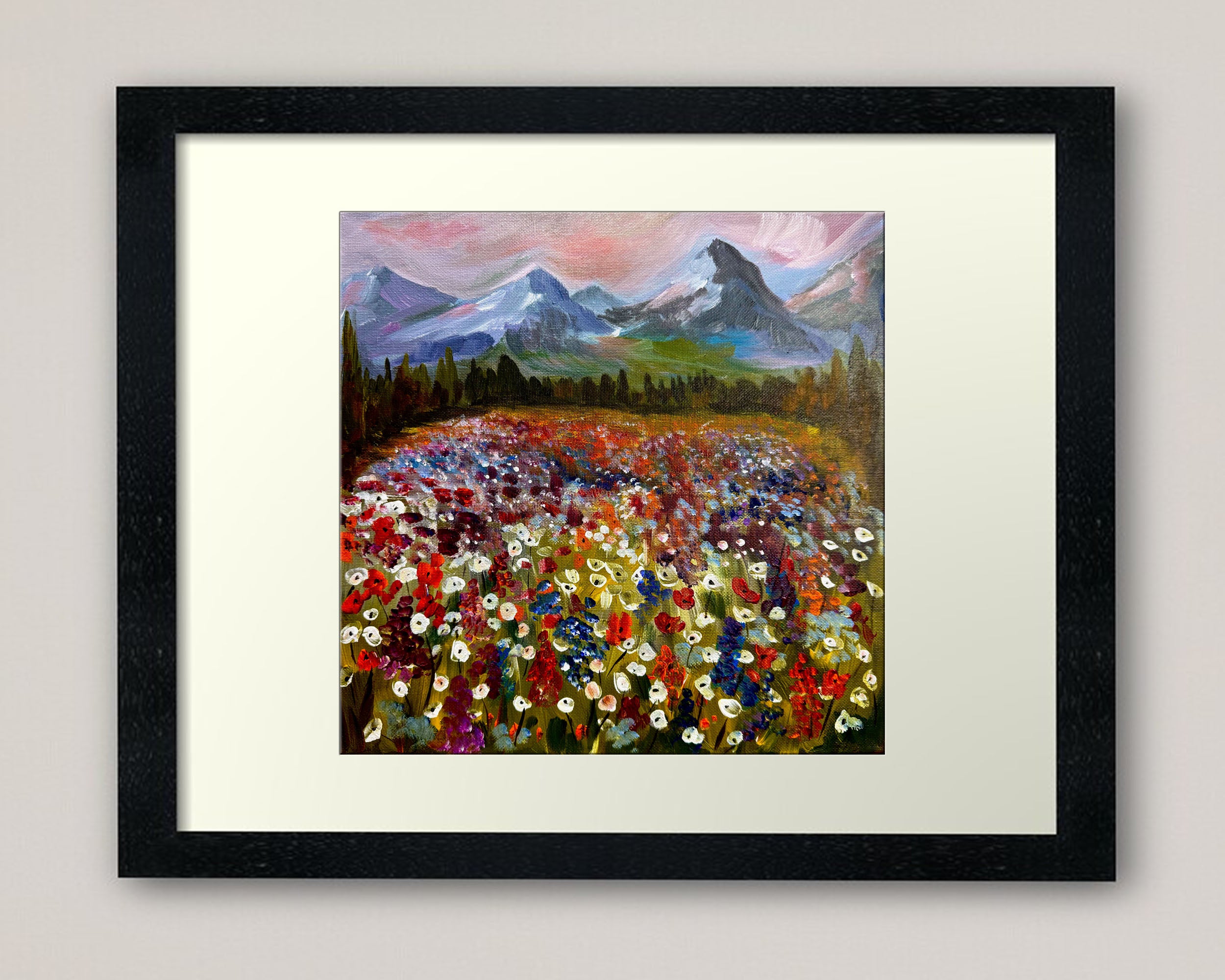 This painting captures that unforgettable moment when summer blooms burst across a mountain meadow and the Rockies rise quietly in the distance. Every flower is alive with colour and movement and truly a tribute to the wild places that stay with us long after we’ve left them.