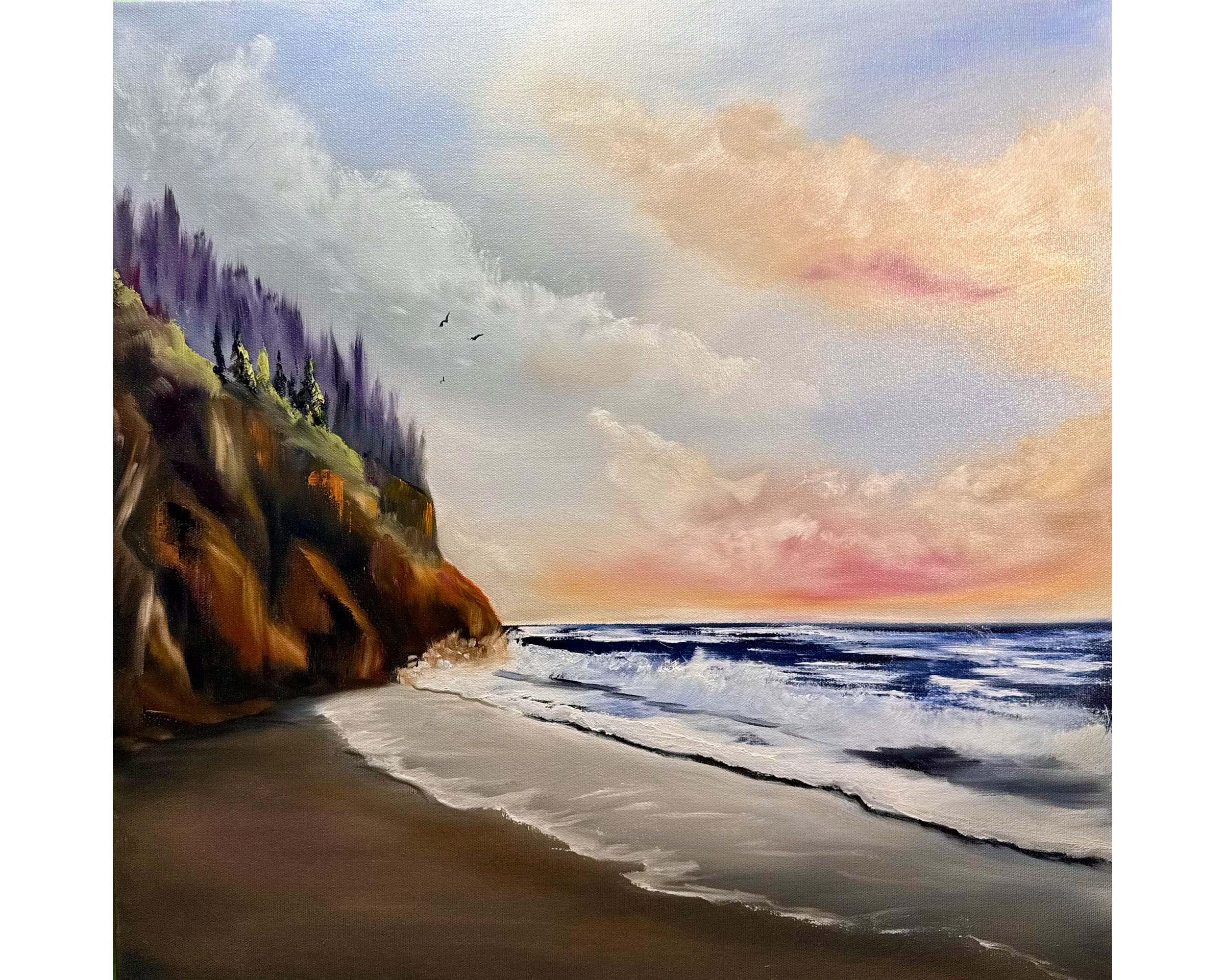 Inspired by the vast beauty of the West Coast and the calming rhythm of nature, this painting invites the viewer to pause, breathe, and settle into the closing moments of the day. It is a celebration of light’s ability to guide us, comfort us, and gently bring the day to rest.